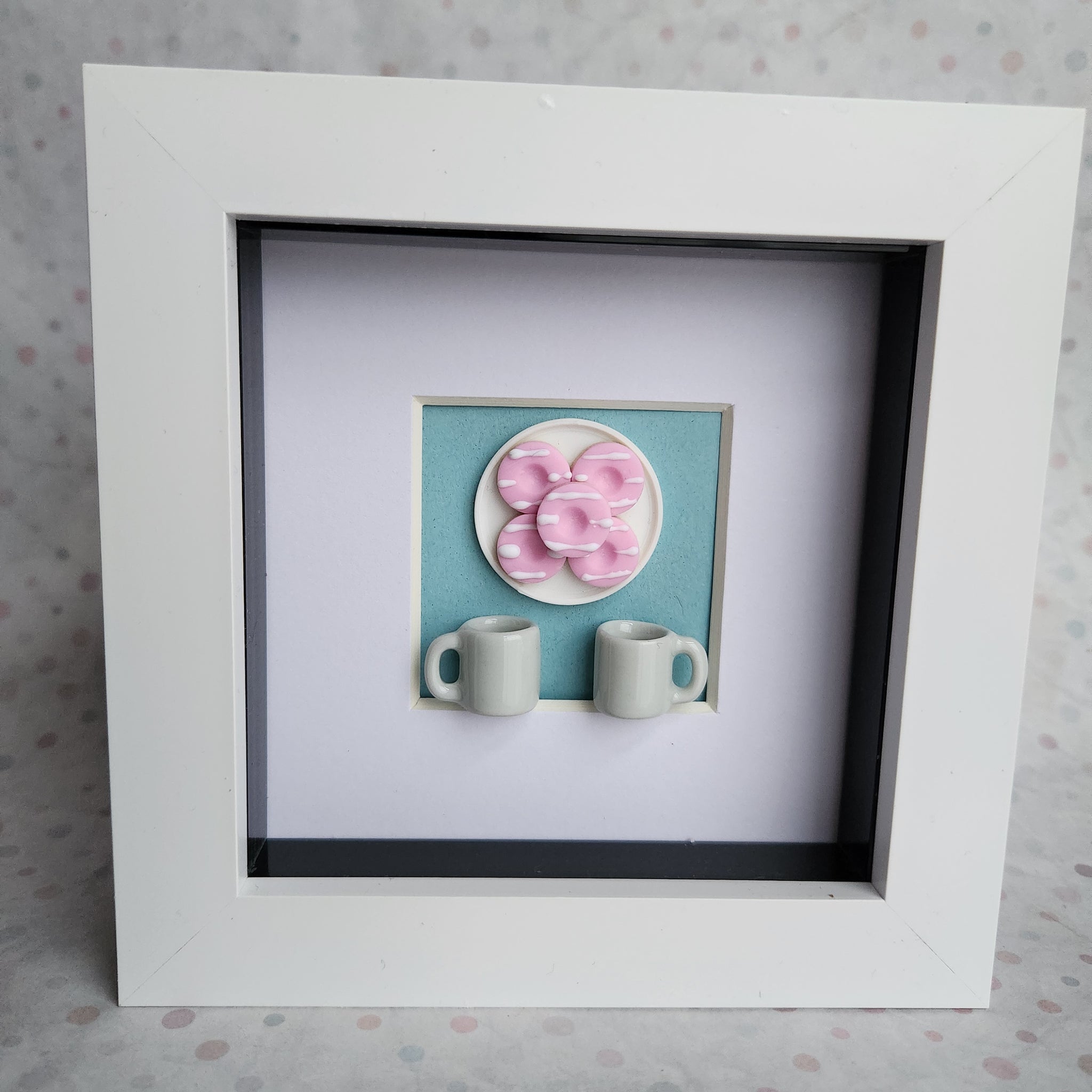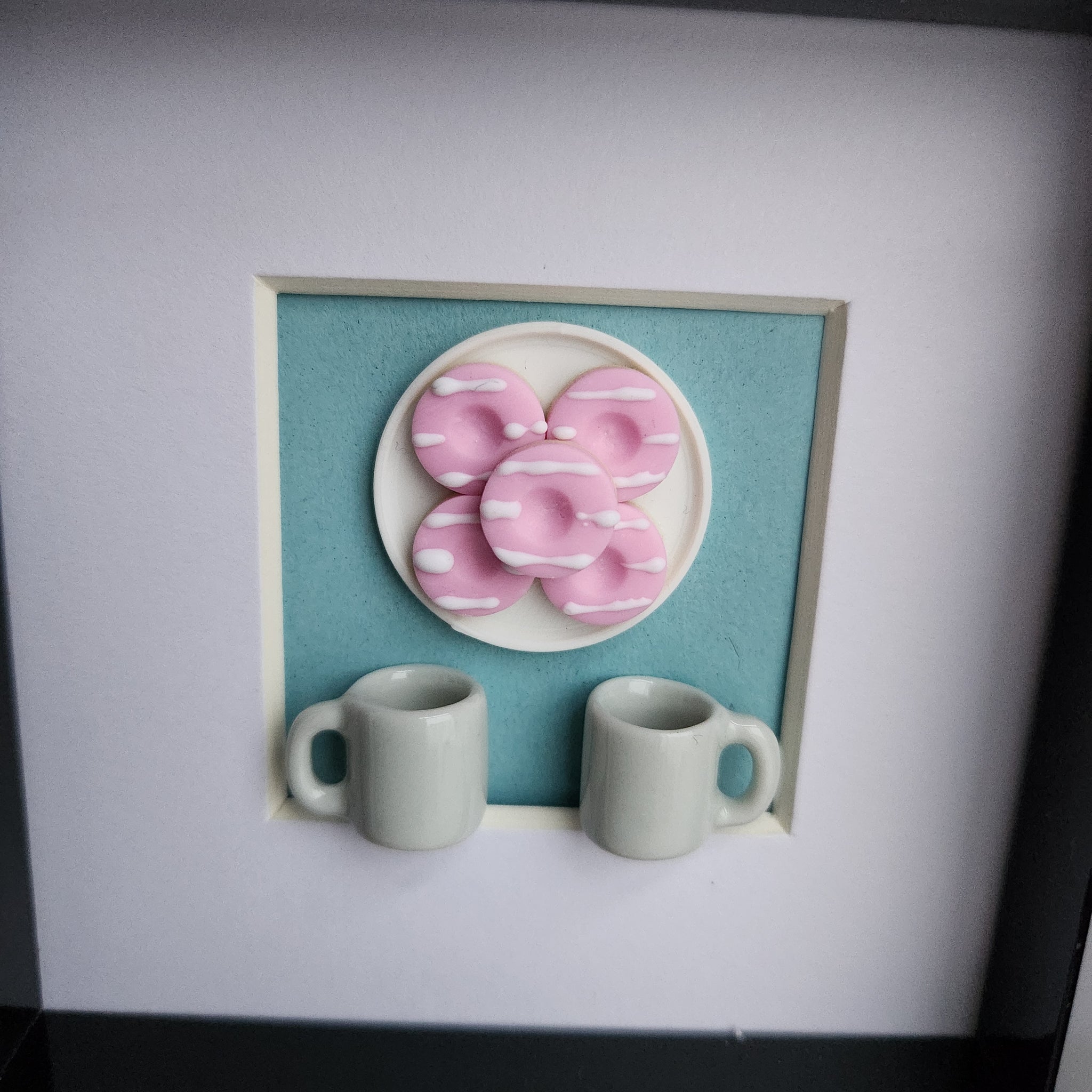 Miniature tea and biscuits. The frame is chunky acrylic plastic that measures 5 inches square.