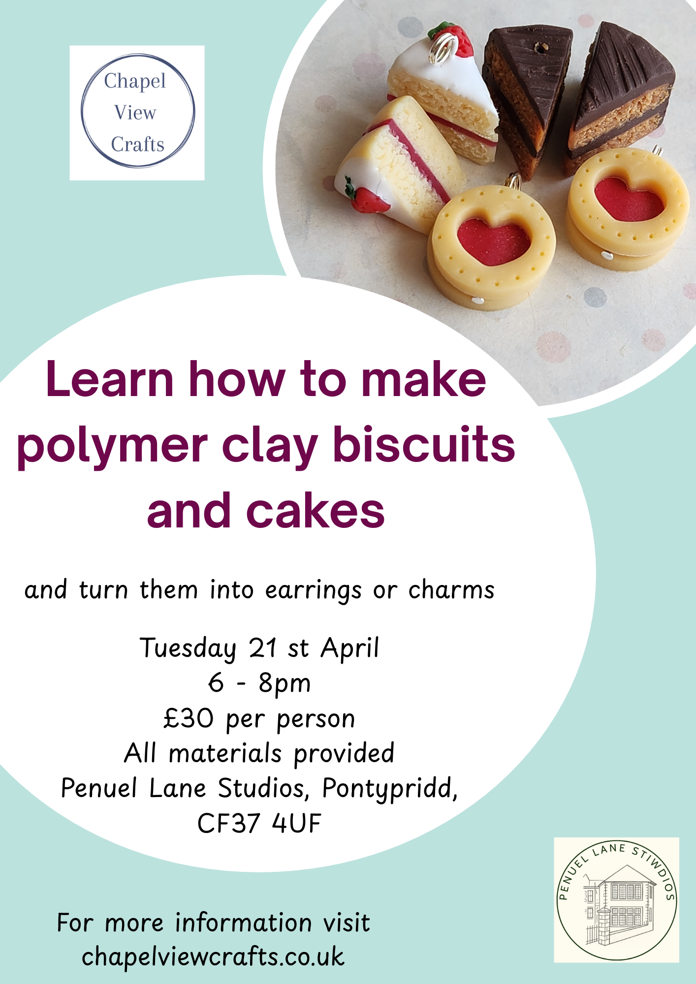 In a 2 hour long in person workshop you will guided through the steps to make polymer clay cakes and biscuits that can be turned into earrings or stitch markers.